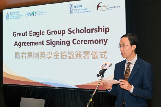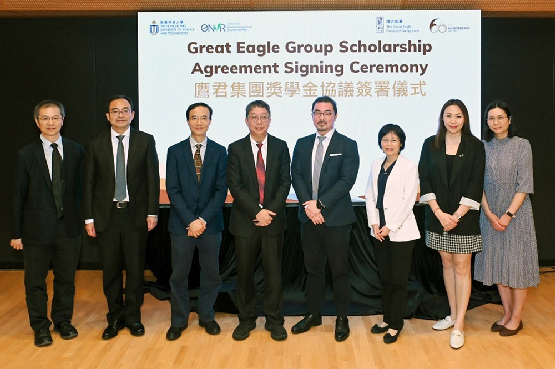 Officiating at the scholarship agreement signing ceremony were Great Eagle Holdings Limited Executive Director, Mr. Alexander LO, HKUST Associate Provost (Teaching & Learning) Prof. Jimmy FUNG, HKUST Director of Interdisciplinary Programs Office (IPO) Prof. Huamin QU and HKUST Head of ENVR Prof. Alexis LAU.